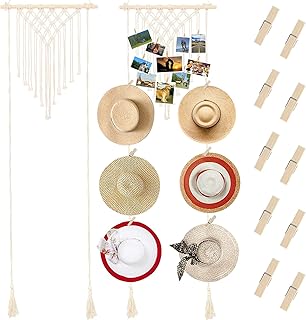 2 piezas boho sombrero estante de madera organizador con 10 clips tejido sombrero colgador de almacenamiento para colgar en la pared sombrero titular pantalla para hombre y mujer ala ancha y sombrero Fedora exhibición salón dormitorio decoración